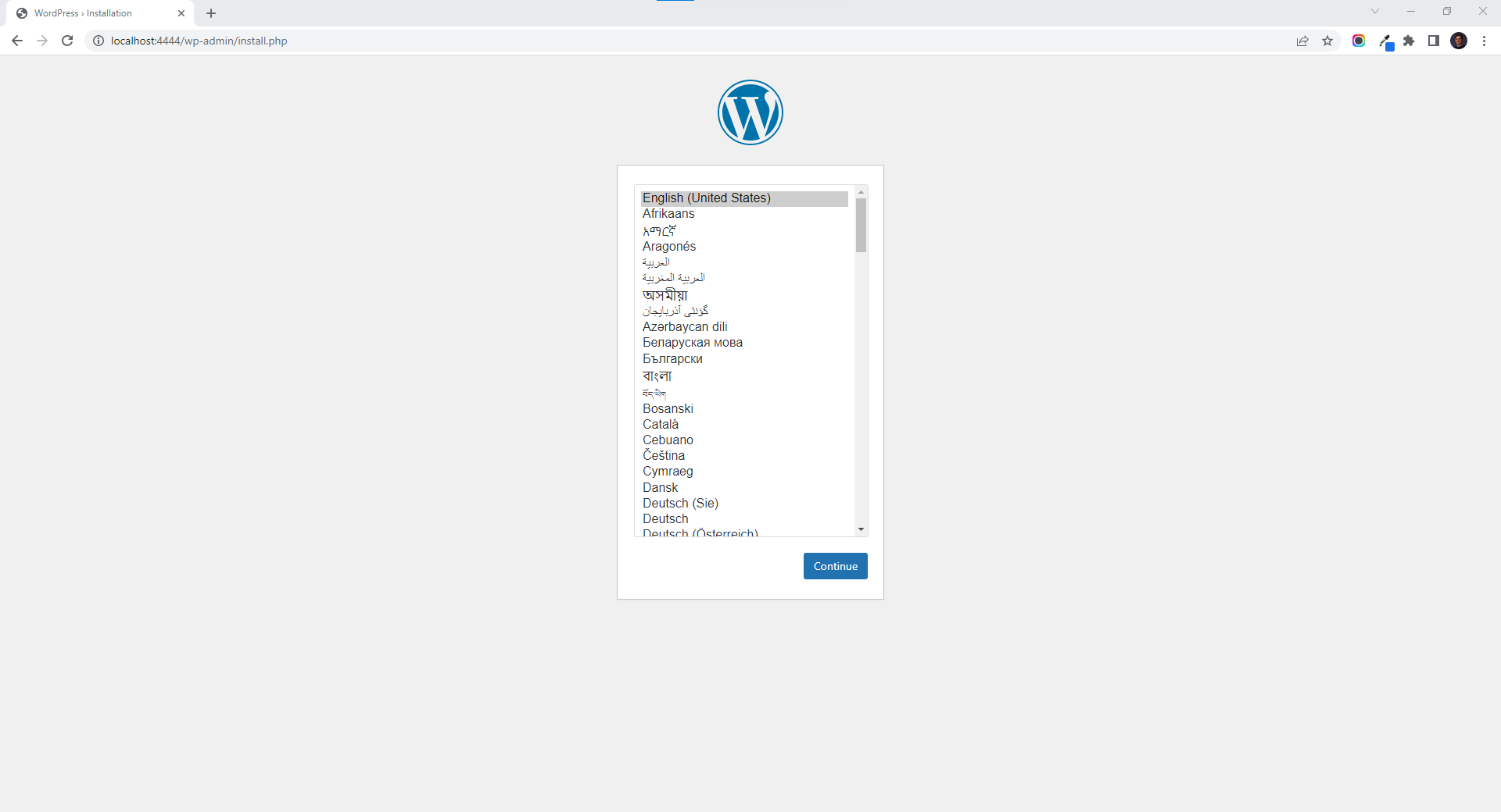 Once the deployment is successful, WordPress is ready to use at [**localhost:4444**](http://localhost:4444) by default, as seen below.